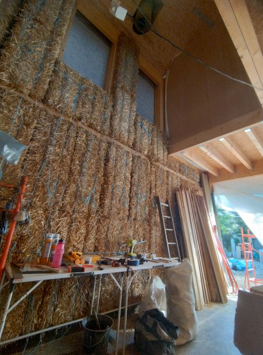 Le chantier paille avance également à bon rythme et nous avons désormais terminé les 2/3 de l'isolation paille, mais surtout nous avons tapissé intégralement le futur mur en double hauteur !