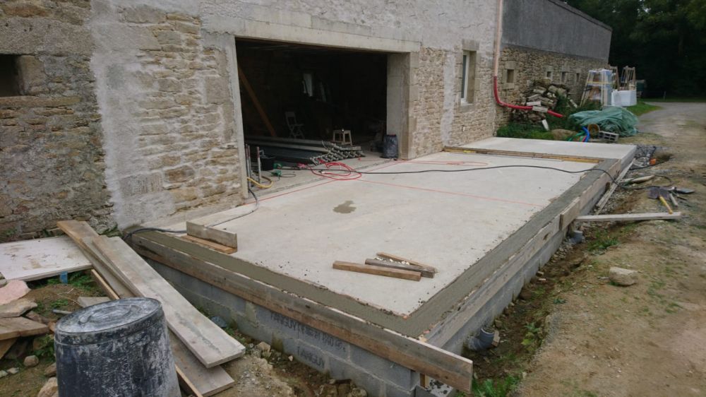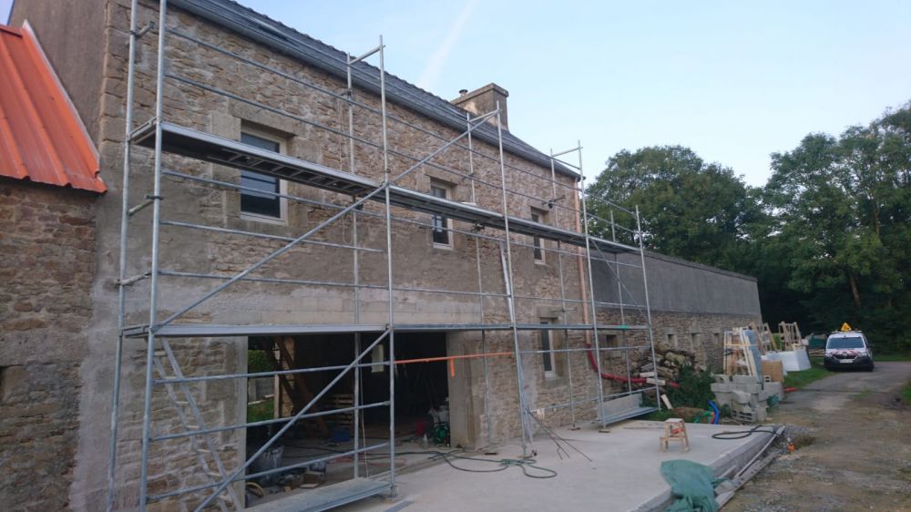 Nous avons enlevé temporairement l'échafaudage afin de réaliser un muret de soubassement pour la future véranda, étape nécessaire pour pouvoir finaliser la chaux.