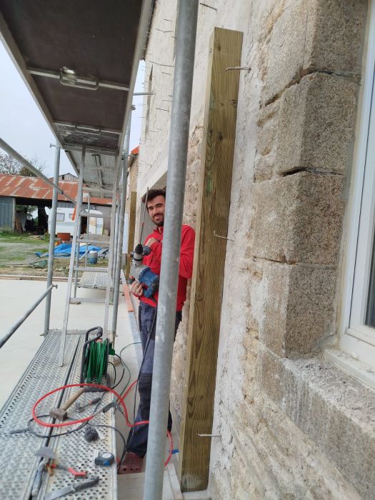 - Enduit chaux, pose d'isolant et bardage sur la façade