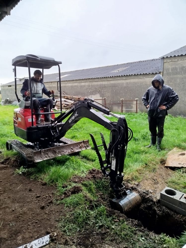 Avec la tempête Benjamin, nous nous abritons sous le hangar et creusons à la minipelle les fondations de sa future dalle.