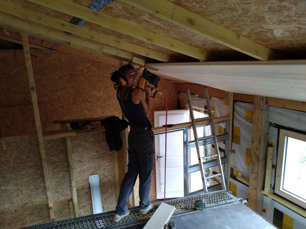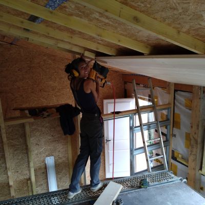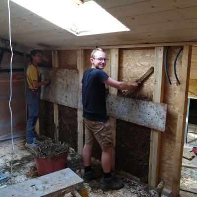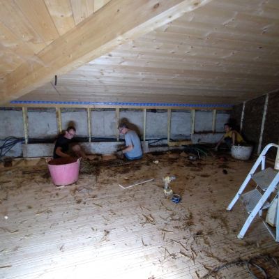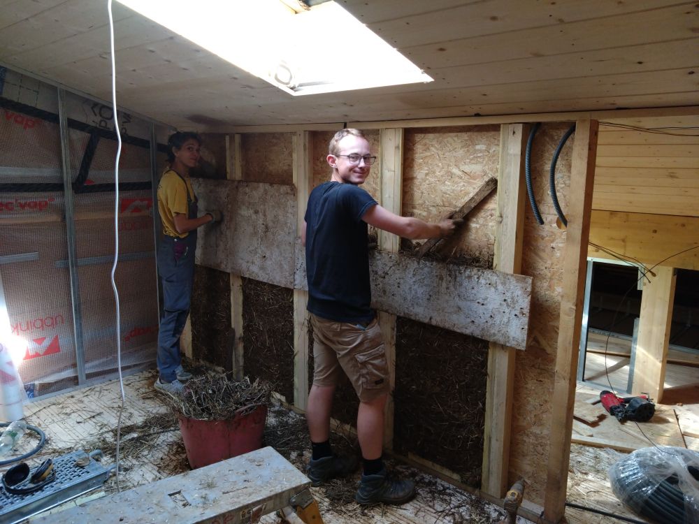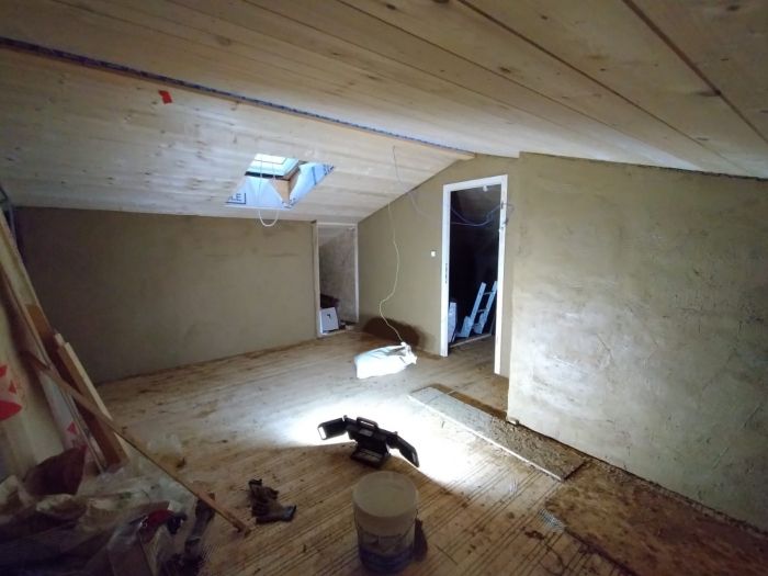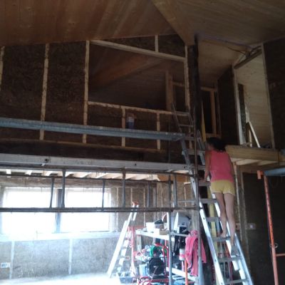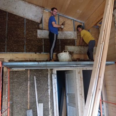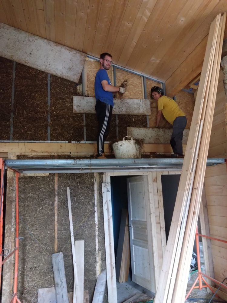 En 2025, travaux intérieur, construction du planché de l'étage et des cloisons ossature bois, remplissage des cloisons en terre/paille allégé.