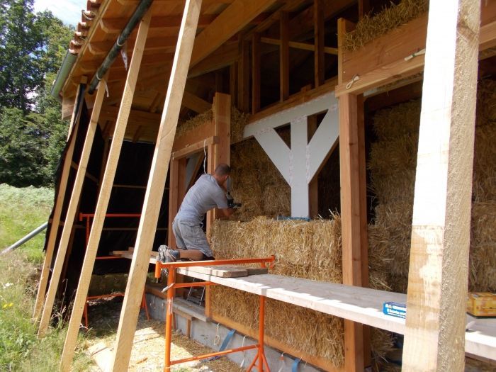 Depuis un an, nous construisons notre maison bois et paille : ossature poteau-poutre traditionnelle et des murs paille excentrés à cette ossature, bâtis comme de la paille porteuse.