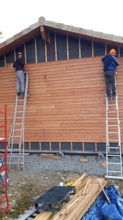 Réalisation du bardage sur l'ensemble des murs extérieurs de la maison. Le par-pluie et les liteaux de fixation sont en place, ainsi que les grilles anti-rongeurs.