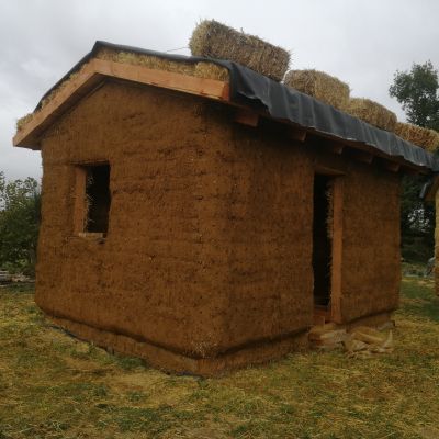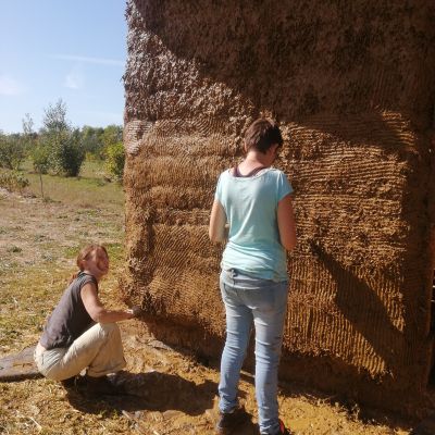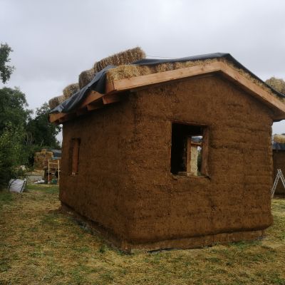 Je vis dans une ferme avec mon compagnon, chacun dans notre maison en terre paille. Sur la ferme, la première maison en terre/ paille à été construite en 1997, puis la grande maison il y a 20 ans, deux autres petites sont arrivées par la suite en 2016 et 2023.