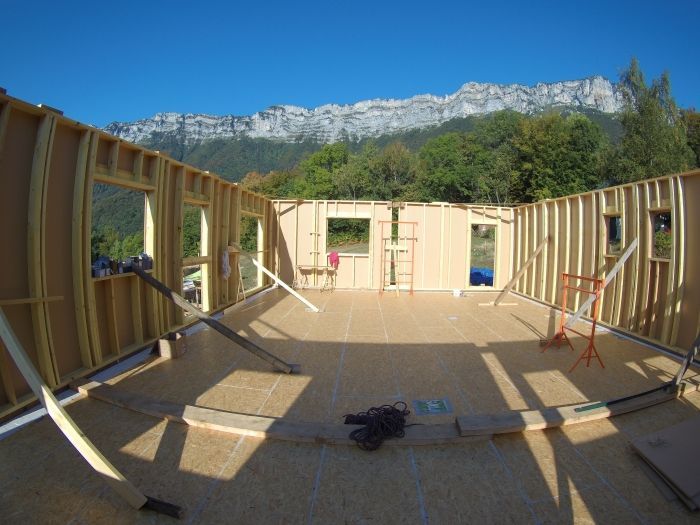 Nous faisons appel à une scierie locale pour dimensionner le projet et nous assister ponctuellement. Maison zéro béton, menuiseries PVC certes mais fabriquées localement.