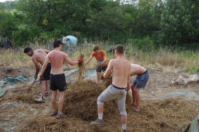 Le chantier a démarré il y a deux ans et s'anime depuis chaque été avec l'aide de bénévoles. La première année nous avons démonté puis construit une nouvelle toiture isolée en botte de paille, l'an dernier nous avons réalisés la moitié de l'isolation du bâtiment en paille terre. Cette saison, nous devons réaliser l'autre moitié de l'isolation. Fort d'une technique maintenant rodée et d'une expérience que nous voulons partager, nous souhaitons cette année travailler sur trois sessions de deux semaines chacune afin de donner une nouvelle dynamique au projet et transmettre un savoir (et pourquoi pas l'améliorer).