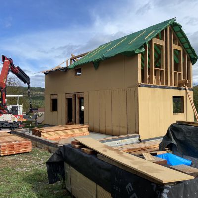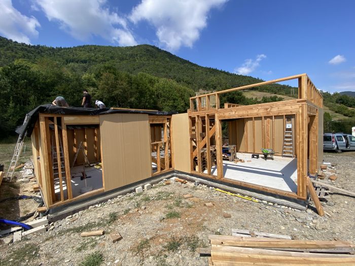Il s’agit d’une maison individuelle en L (et pas en A !) de 130m² sur 2 niveaux, ossature bois avec un mélange de cadres et de poteaux-poutres et une isolation paille.