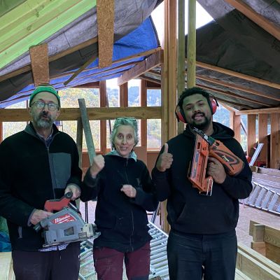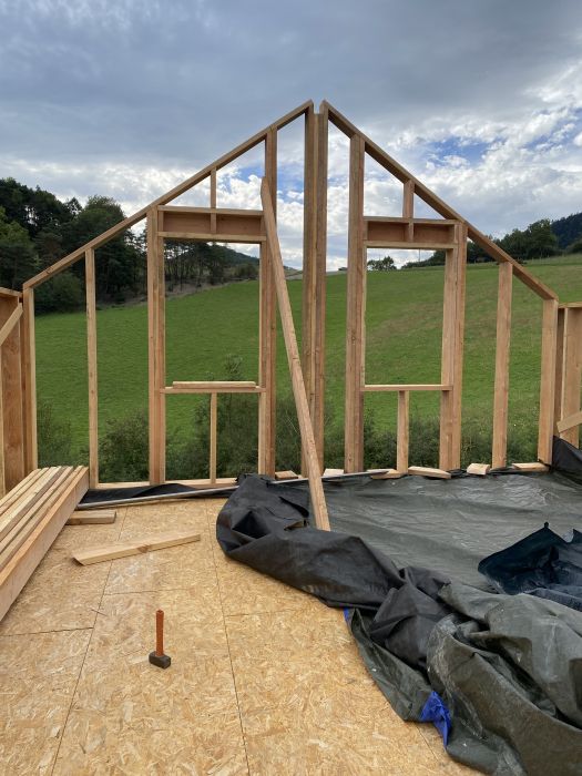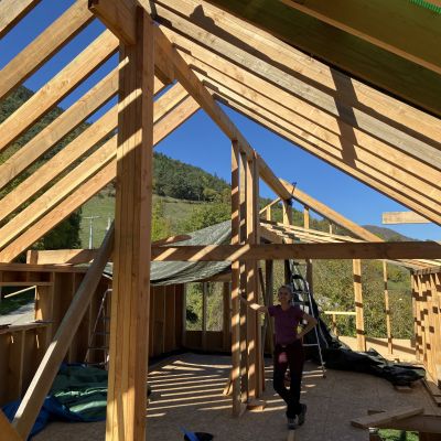 Nous ne sommes pas du tout du métier (Claire Sophrologue, J-Yves infirmier), mais c’est le visionnage de la vidéo d’Elisabeth (peut-être l’avez-vous vue ?), qui à plus de 60 ans a construit sa maison en A presque toute seule, que nous nous sommes dit “pourquoi pas nous ?!”.