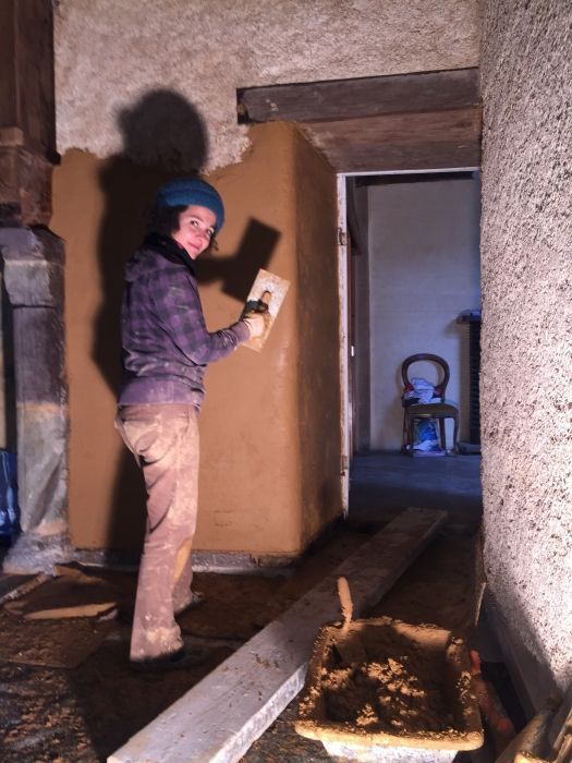 Ensuite pose de tomettes et en septembre, enduit pierre vue sur mur pierre intérieur ainsi que enduit finition terre sur corps enduit chaux chanvre.
