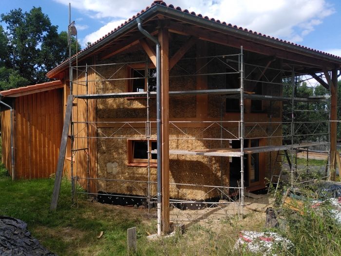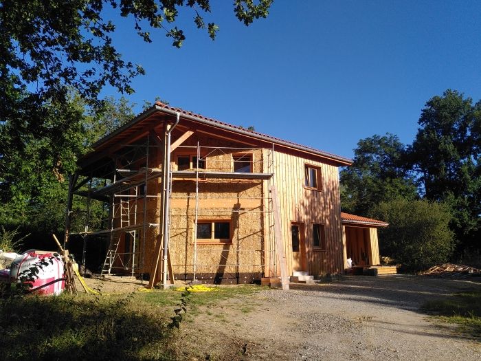 Nous vous proposons un chantier participatif pour la construction de notre maison en ossature bois, bioclimatique. Le chantier a débuté l'an dernier et se poursuit par les enduits de finitions sur corps d'enduit terre/paille/sable et sur cloisons en fermacell du 11 au 15 décembre