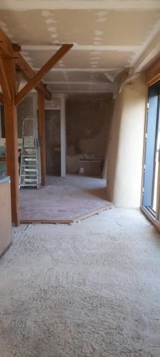 Il reste encore beaucoup de choses à faire mais il y en a aussi beaucoup derrière nous : mise en place d’une phytoépuration, installation d’une cuve de récupération d’eau de pluie pour les toilettes et le jardin, installation d’une nouvelle charpente de fermettes en douglas, isolée en ouate de cellulose soufflée, nouvelle toiture en ardoises, mise en place de panneaux solaires thermiques, mise en place d’un complexe de sol inspirée des conseils d’une association de rénovation de bâti ancien locale (décaissement jusqu’aux fondations, mise en place d’un hérisson ventilé, isolation par des panneaux de liège sur 8 cm d’épaisseur puis dalle de chaux pouvant désormais accueillir la suite…), mise en place d’un portique en chêne accueillant le nouveau solivage en douglas isolé phoniquement en ouate de cellulose et fermacell/sol, isolation intérieure du mur nord en laine de bois, enduit intérieur du mur ouest en chaux chanvre, enduit intérieur des murs sud et est (mur de refend) en terre paille,