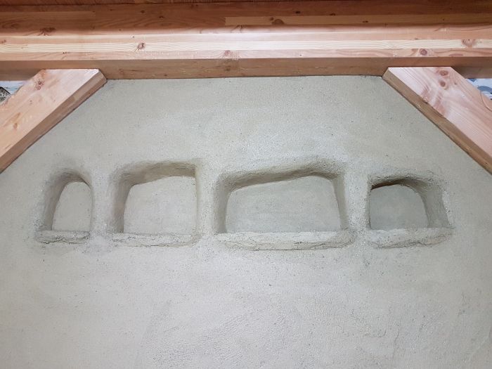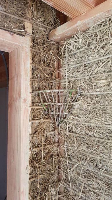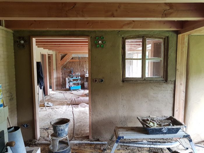 •Application de l’enduit terres sur mur en botte de paille et sur cloisons légères