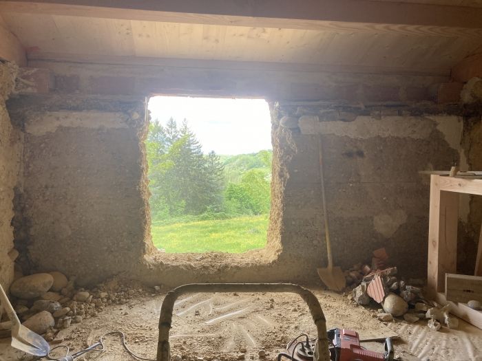 Actuellement nous en sommes à faire faire des ouvertures par des maçons piseurs chevronnés puis un solivage qui accueillera un plancher et avec nos 3 garçons nous avons déjà enlevé les anciens enduits intérieurs.