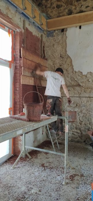 - Pose d'un mortier terre-chanvre plus gras sous forme d'enduit dans
