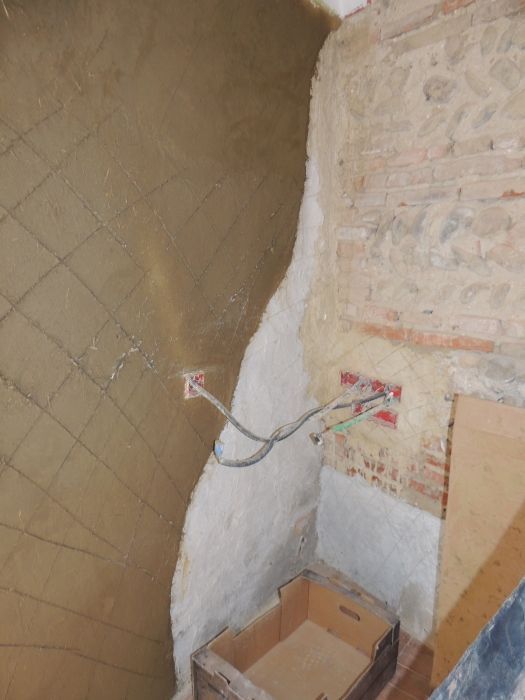 2- pose de structures d'accueil des radiateurs (bois), des placards (briques de terre cuite industrielles récupérées) et scellement des équipements électriques au mortier cerrique ( terre chaux paille) (Fait)