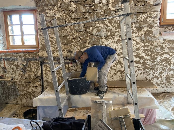 - pose de l’enduit chaux-chanvre (étape qui nécessite des bras)