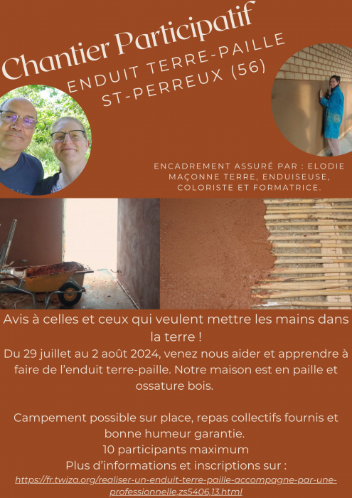J’ai fait appel à une professionnelle pour encadrer le chantier. Elle est formatrice et maçonne, enduiseuse et coloriste. Elle propose de former et d’accompagner les participants sur les techniques d’enduit en terre-paille.