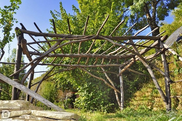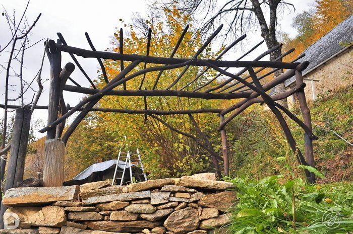 Construction d'une pergola en châtaignier mort sur pied, bois tordu. Utilisation d'outils anciens (dont plane). Technique du shou sugi Ban (bois brûlé). Montage de la structure.