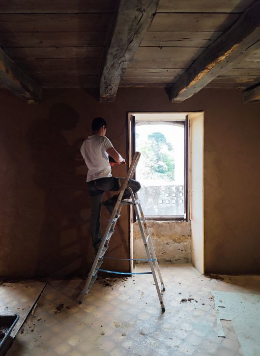 Réaménagement d’une maison de ville proche du centre historique de Morlaix, en vue de devenir notre résidence principale. De nombreux aléas contextuels, constructifs et conjoncturels nous ont contraints à passer d’un projet sobre et frugal en montage classique, à un chantier partagé entre interventions spécialisés (GO, charpente, fluides) et auto-construction.