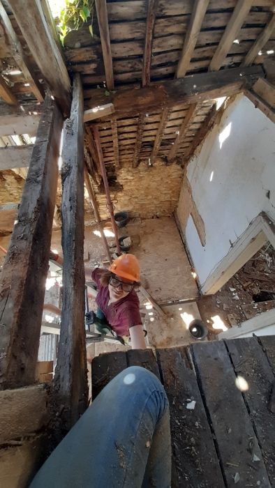Avis aux curieux car peut-être des découvertes insolites à faire, ambiance chasse au trésor, tout en sécurisant les lieux (pose d'étais et montages d'échafaudages) : l'objectif est d'intervenir pour la mise hors d'eau avant les chantiers participatifs et travaux suivants dans le but d'en faire notre prochain lieu de vie et d'accueil.