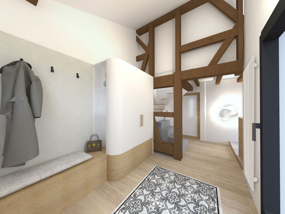 Dans une ferme en pisé et à colombage, nous avons accompagné notre cliente dans le réamanégement de son entrée, pour gagner en place et en confort.