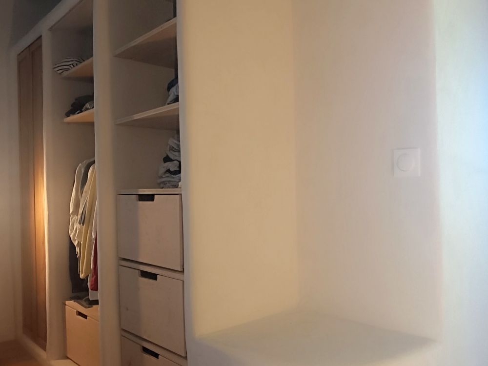 Après la purge des enduits ciment et plâtre de toute la pièce, démolition des doublages et remaniement de maçonnerie (conduit de cheminée écroulé, affaissement du linteau de fenêtre) : dressage d'enduits de correction thermique (chaux-liège en partie semi-enterrée et chaux-perlite au Nord). construction de dressings en béton cellulaire. Enduits de finition chaux-sable de toute la pièce et colature chaux-marbre teintée pour l'unité esthétique.
