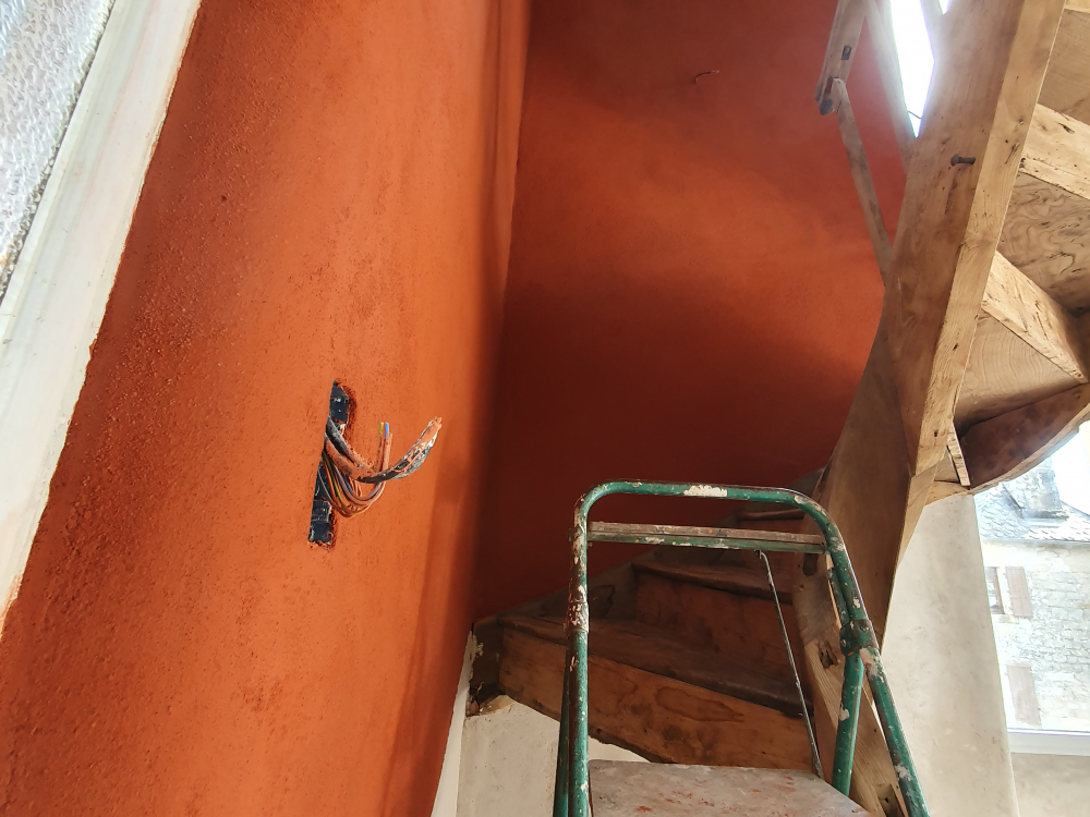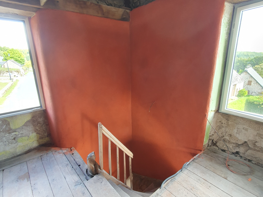 Enduit couleur rouge dans la zone de l'escalier avec sa finition taloche éponge.