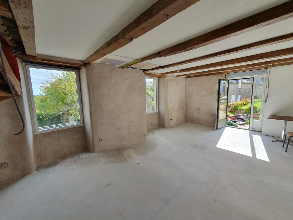 Enduit couleur chaux naturelle sur le reste des murs du RDC avec une finition lissée (les différences de teintes sont ici dues aux différences de séchage).