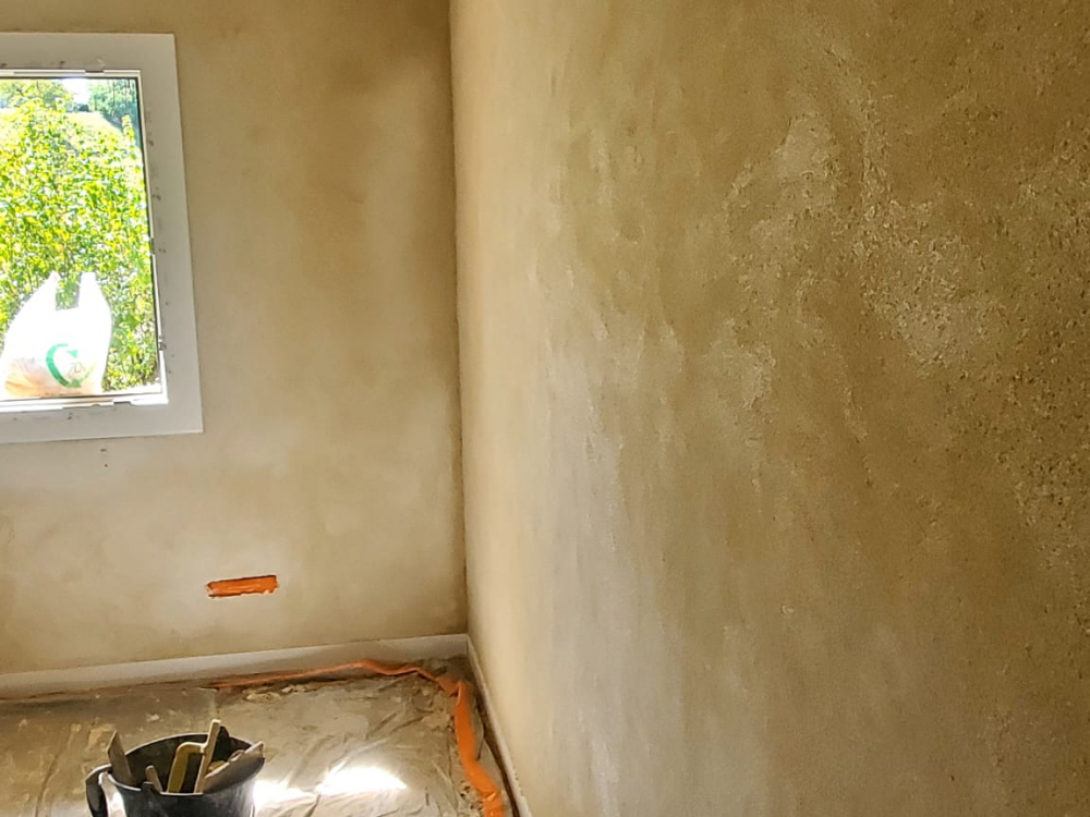 Application d'un enduit de finition terre blanche et chaux aérienne.