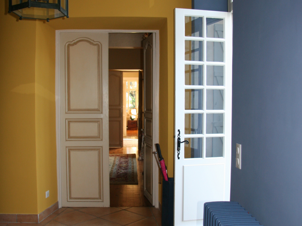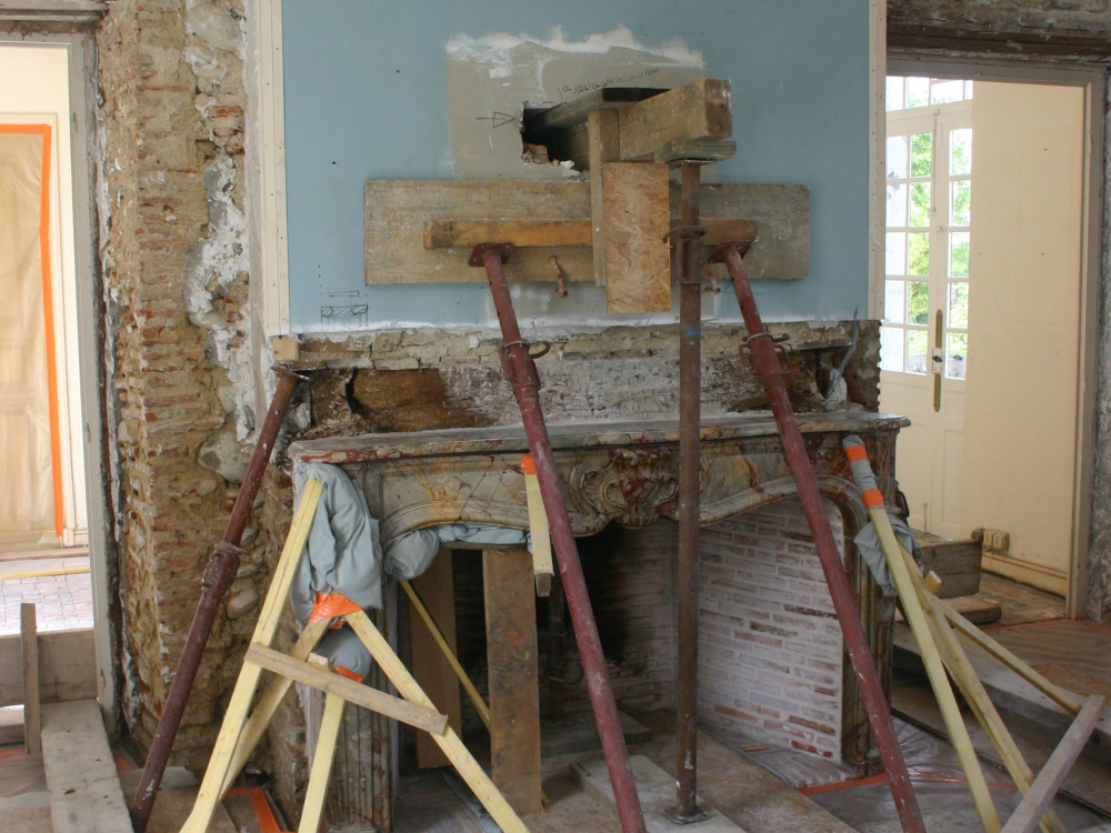 Ici l'endroit de la cheminée avant/après travaux ainsi que le rendu final après rénovation et peinture des plâtres anciens dans la cage d'escalier.