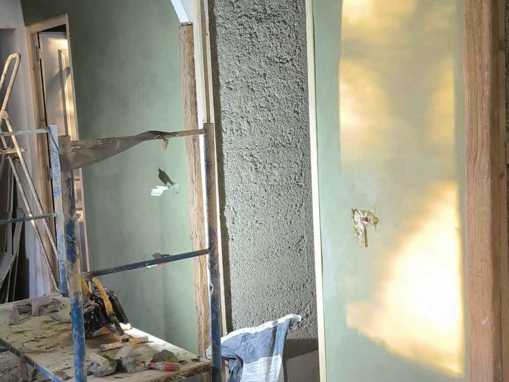 Support en béton de chanvre banché et béton cellulaire en soubassement pour la partie enduit de finition et support en pierres de Bidache pour la partie rejointoiement.