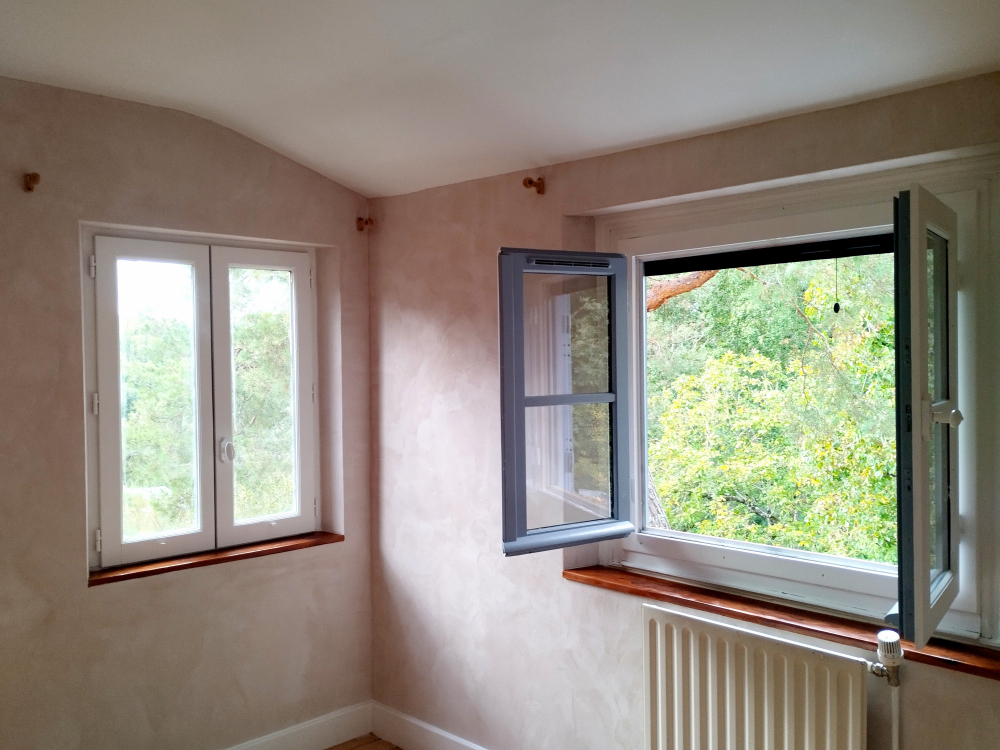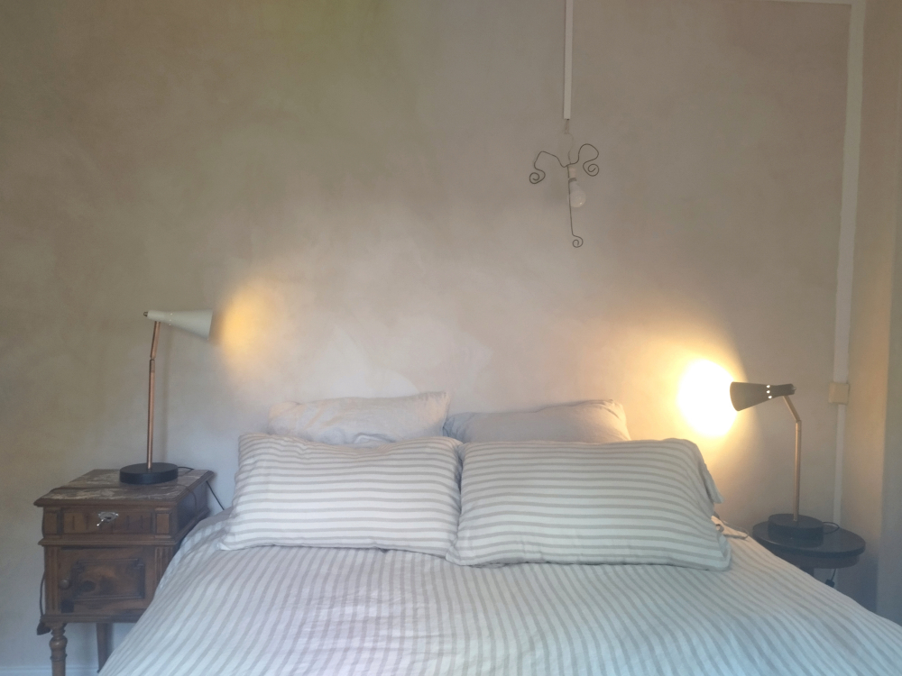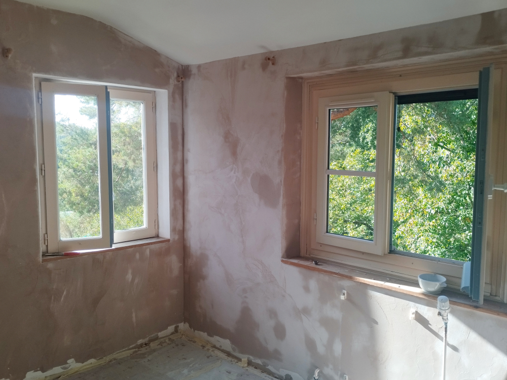 Enduit fin à la chaux en deux passes sur murs en plâtre, finition texturée et fine à la lisseuse japonaise. La pièce est chaleureuse, accueillante et saine.