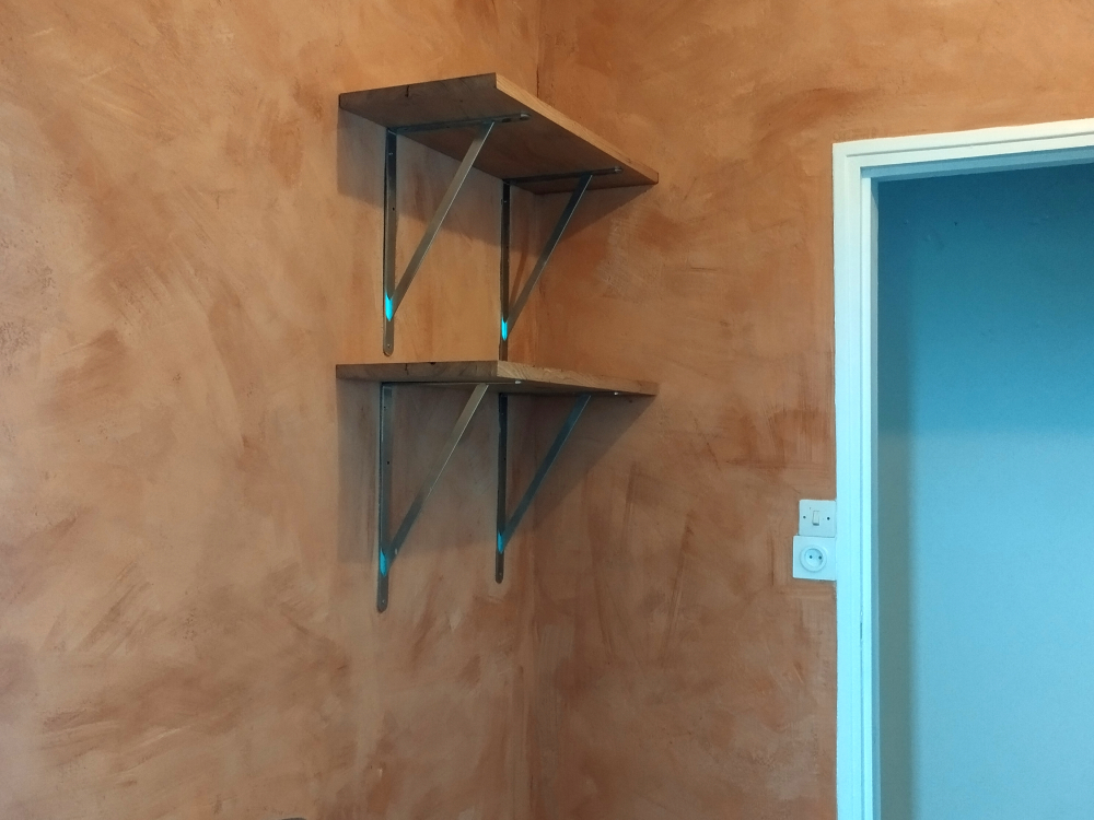 Enduit fin (sable 0-2) à la chaux sur mur en plâtre (il faut créer une accroche avant la pose de l'enduit de finition) puis badigeon.