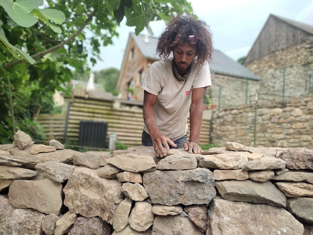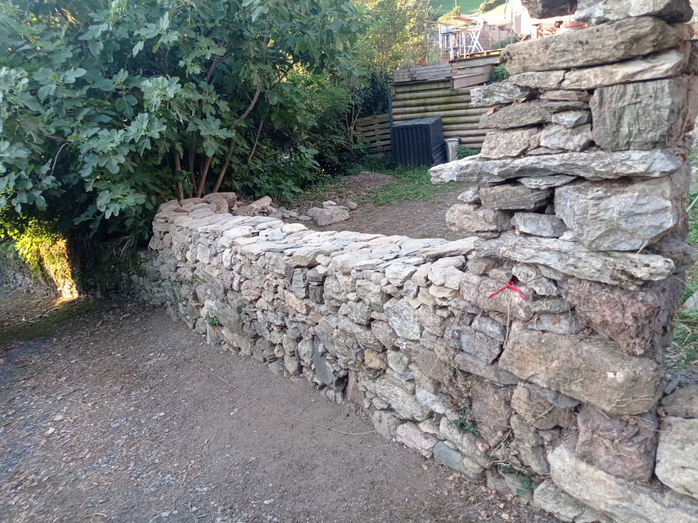 Le mur de soutèment existant s'élevait pour faire une séparation entre le jardin et la rue, mais des parties s'étaient écroulées. La partie basse a été conservée et le reste a été déposé. J'ai rebati le mur à deux parements sur 70 cm en réutilisant les pierres sur place.
