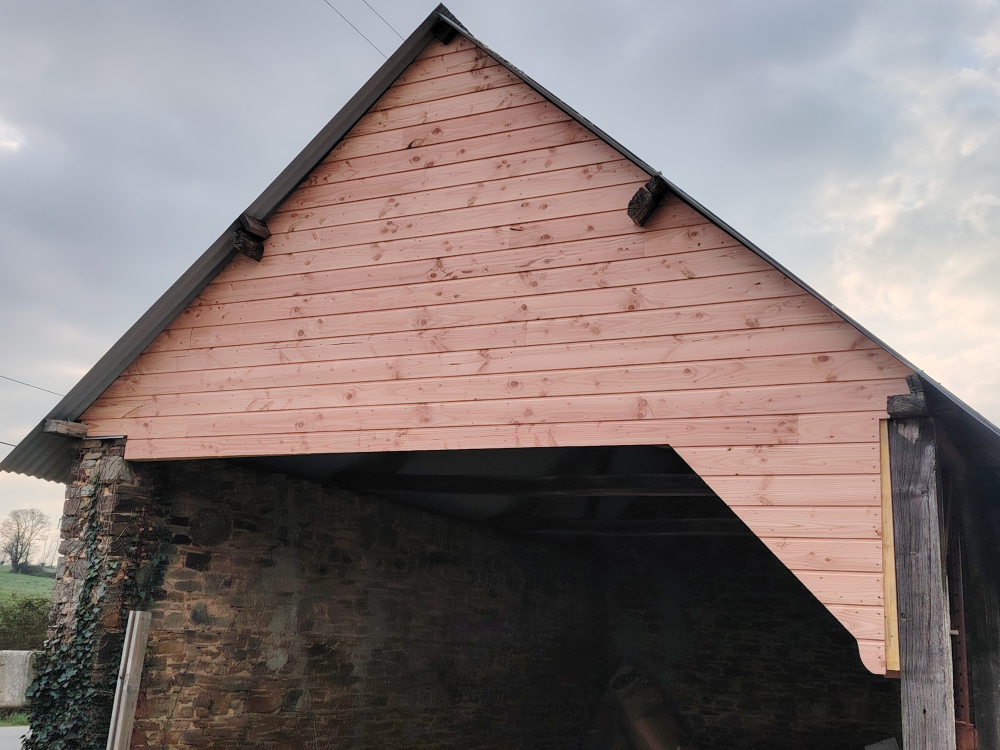 Après l'avoir renforcé en différents points (voir une autre réalisation sur ce même site), j'ai redressé le pignon puis l'ai habillé d'un bardage en douglas (avec fixations inox apparentes).