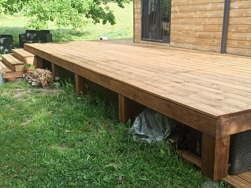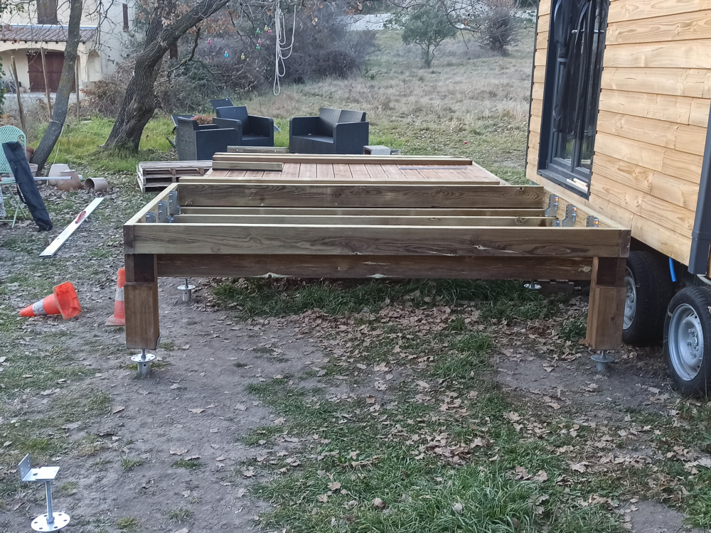 Conception et fabrication d'une terrasse en bois démontable pour une tiny house , cette terrasse agrandi la tiny house vers l'extérieur de près de 20m² , la terrasse est formée de modules de solivage de 1.5m x 2.5m démontable posé sur vis de fondation démontable également.