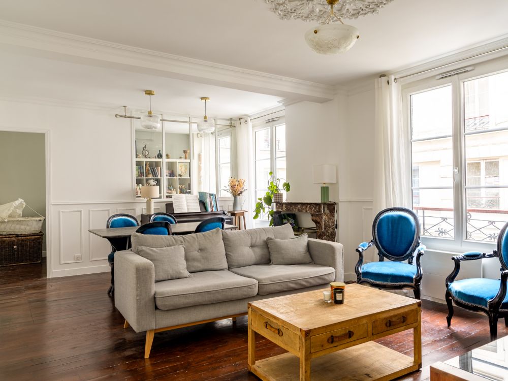 L’Atelier Studio Depommier a repensé les volumes, ouvert la cuisine et valorisé le caractère du lieu en restaurant le parquet d’origine et en restituant moulures et rosace selon les savoir-faire du Faubourg Saint-Antoine.