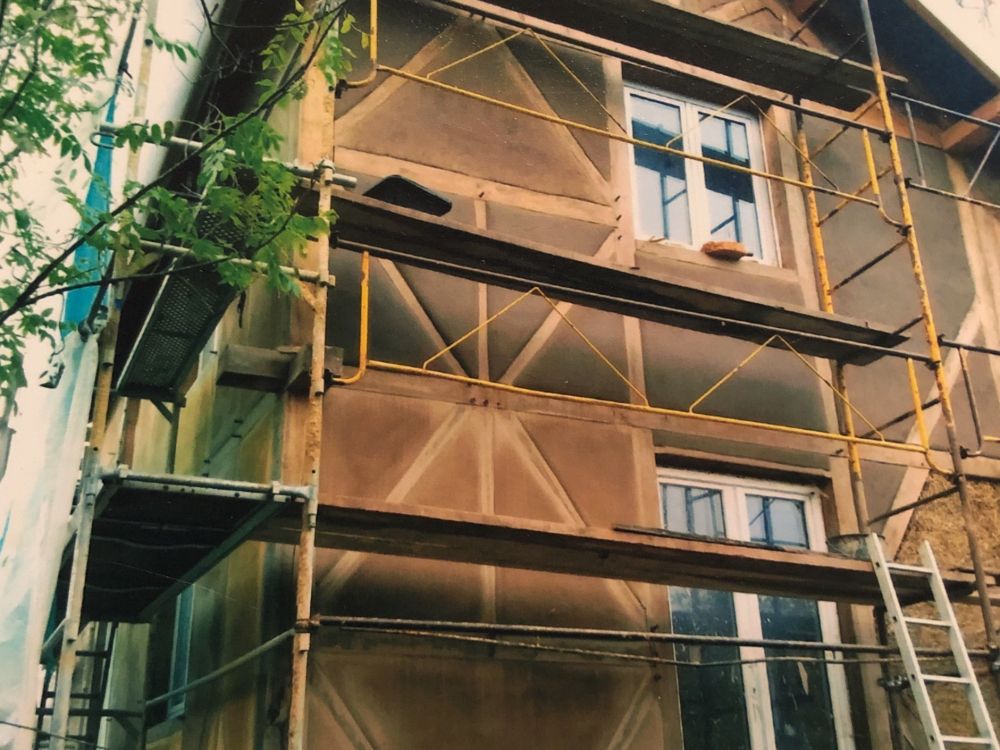 Remplissage des murs en terre-paille banché, isolation de la toiture en paille, enduits terre et chaux.
