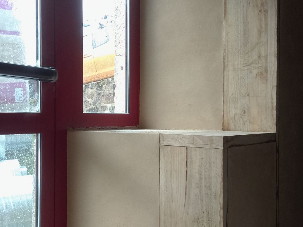 Dans le cadre de cette rénovation d'ampleur, un enduit chaux chanvre est préconisé pour isoler la pièce du salon afin de mettre en avant l'aspect de la matière et la texture particulière du matériau.