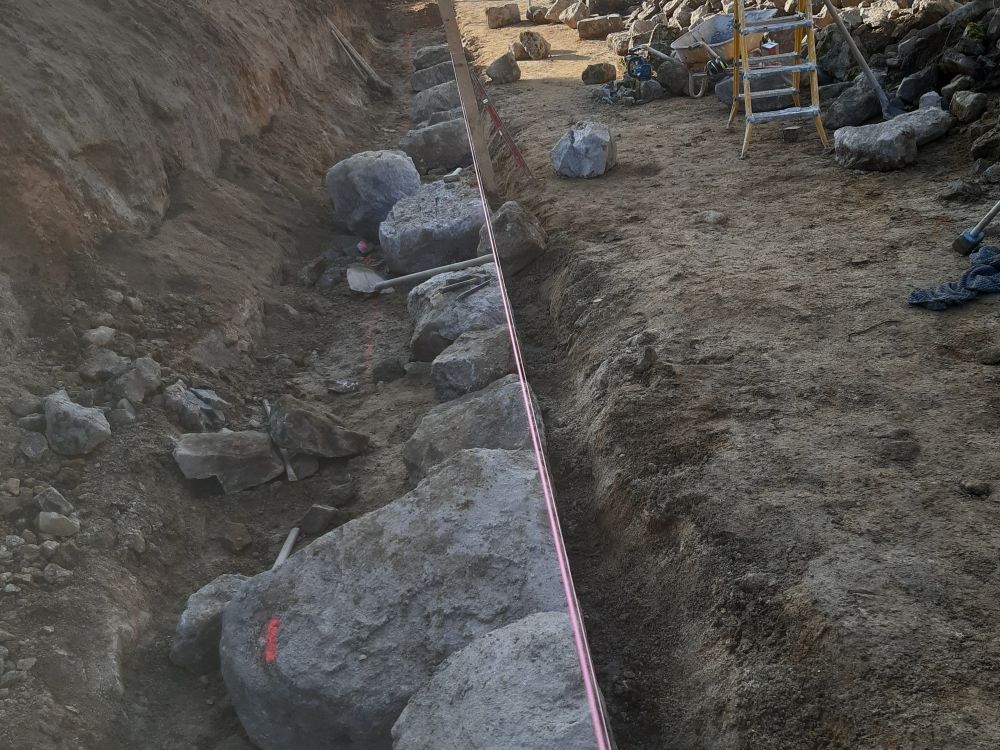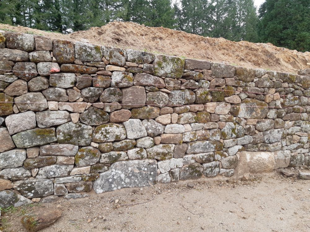 Le soutènement très probablement vieux de plus de 300 ans est déposé, les pierres triées et le talus terrassé afin de permettre le travail au nu de la nouvelle implantation.