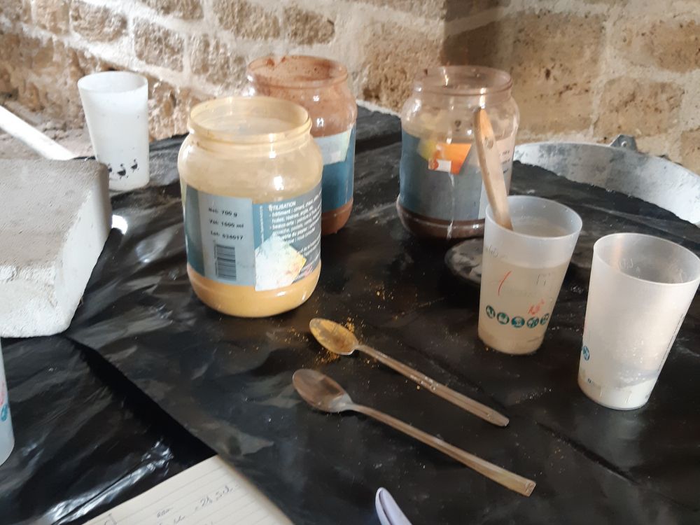 Ici analyse de la terre, détermination de la formulation des enduits et recherche colorimétriques avec les différentes couleurs d'argiles sur place, rose, blanche bleu, incroyable cadeau des sous sols.