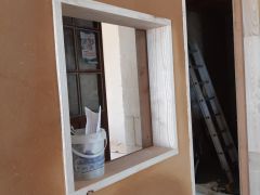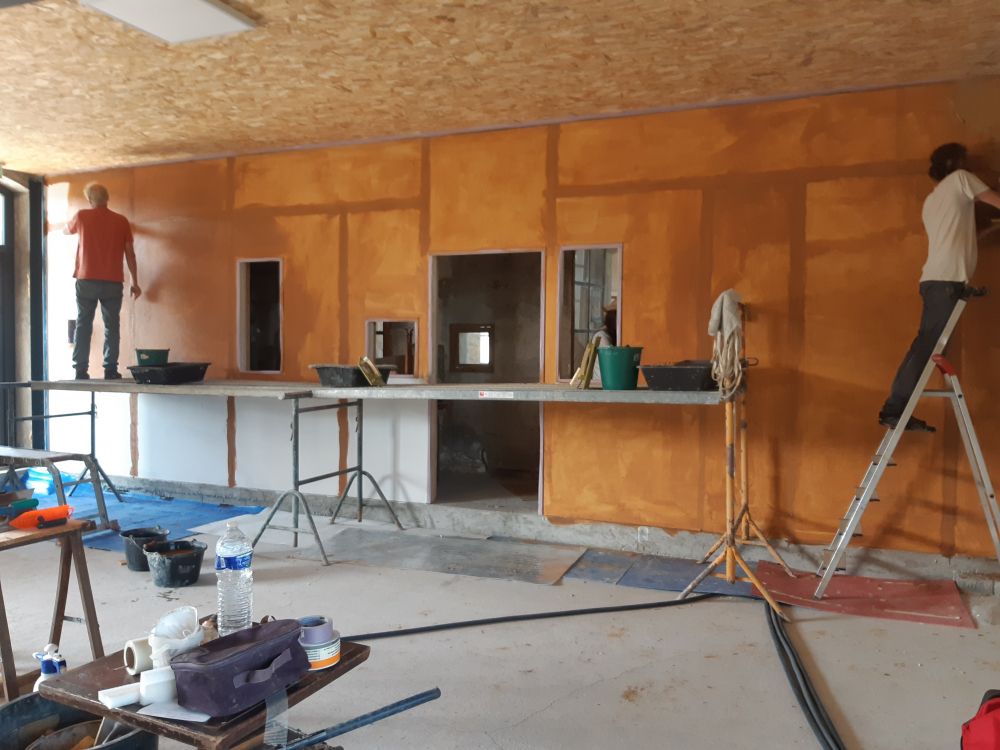 Chantier participatif pour le tiers lieu du Hangar, à Thiviers, réalisation d'enduit en terre avec les mélanges tout prêt de chez argilus, Parfois ça facilite la réflexion le prêt à l'emploi