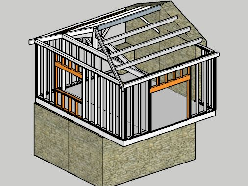 La partie nord du bâtiment qui fait 24m2 recevra la salle de bain, l'entrée et la cuisine. La chambre de 20m2 se logera sous le salon, on y accèdera via un escalier en colimaçon.