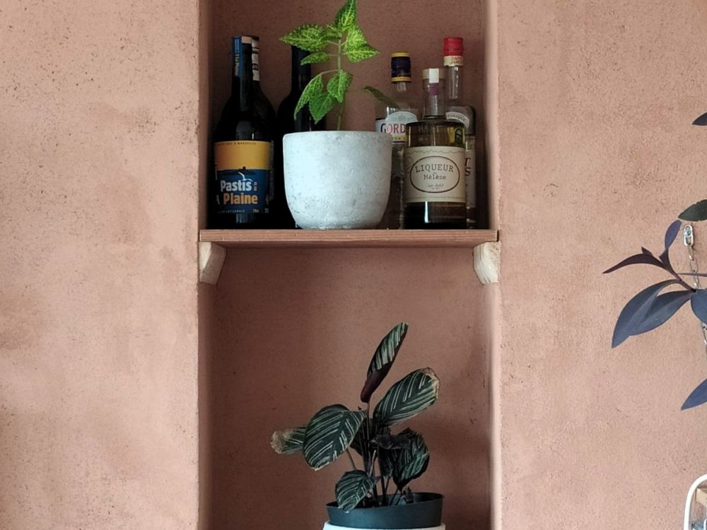 J’ai eu le plaisir de mettre en Å“uvre un enduit terre sur des cloisons en placo, en utilisant : de l’argile locale et du sable blanc tamisé, de la ouate de chanvre et ouate de cellulose pour la texture et empêcher la fissuration, et des ocres de Roussillon pour la couleur, donnant une teinte chaleureuse et naturelle í ¼í¼¿