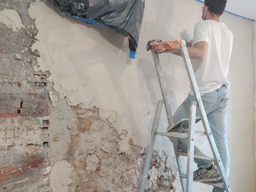 Décroûtage de l’ancien enduit ciment, pour libérer la pierre et permettre au mur de respirer
