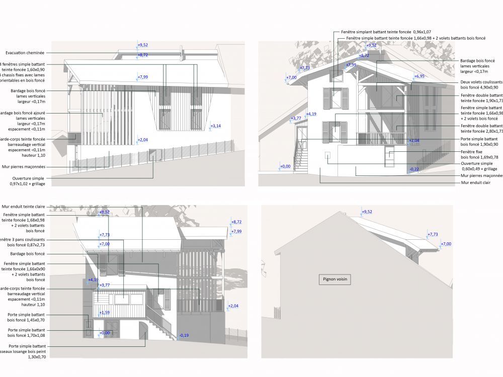 La conception prend en compte l'envie de Thomas de réaliser une grande partie des travaux lui-même. La partie grange nécessite une intervention importante : le bardage sera retiré, la charpente rénovée, des ouvertures seront crées ainsi que des murs à ossatures bois pour accueillir une isolation en fibres biosourcées. Dans la partie maison, une correction thermique en chaux-chanvre sera mise en place sur les murs. L'ensemble des toitures et le plancher entre la cave et le rez-de-chaussée habité seront isolés en biosourcé.