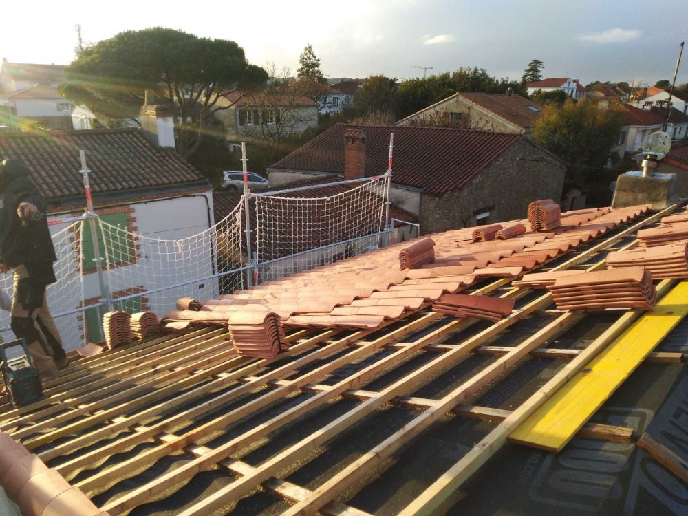 Dans le cadre d’une réhabilitation urbaine, notre équipe a réalisé d'importants travaux de toiture en plein centre-ville. L'intervention a consisté en la dépose et le remplacement de la couverture, suivis d'une mise en conformité de la zinguerie sur les zones critiques. Ce travail de précision sur les chéneaux et les noues permet de renforcer l'étanchéité globale de la toiture tout en respectant les contraintes esthétiques et architecturales du secteur.