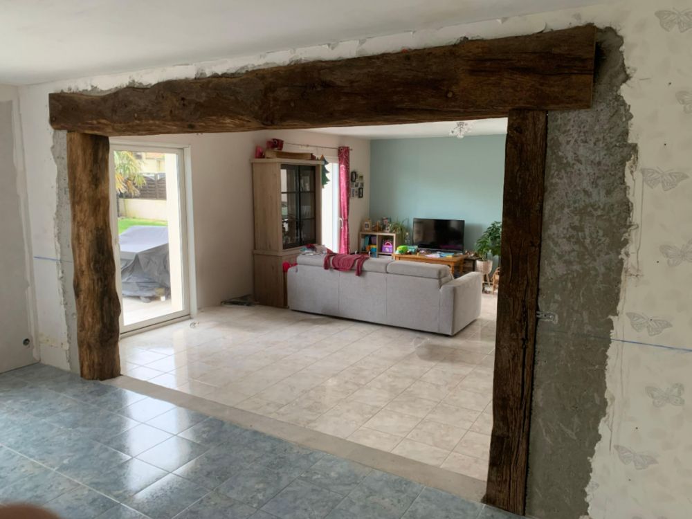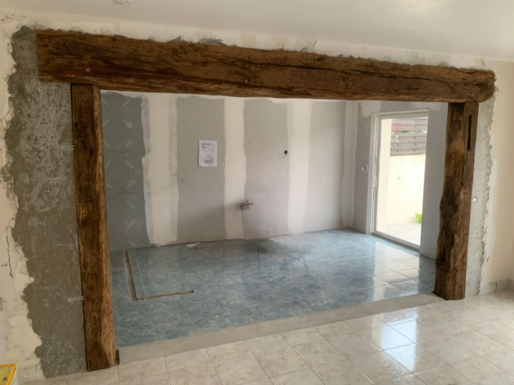 Vieux poteau chêne creusé à l'atelier puis posé et ajusté sur place pour participer à la rénovation d'une maison d'habitation en cachant l'IPN et apporter du charme à cette rénovation en cours de travaux.
