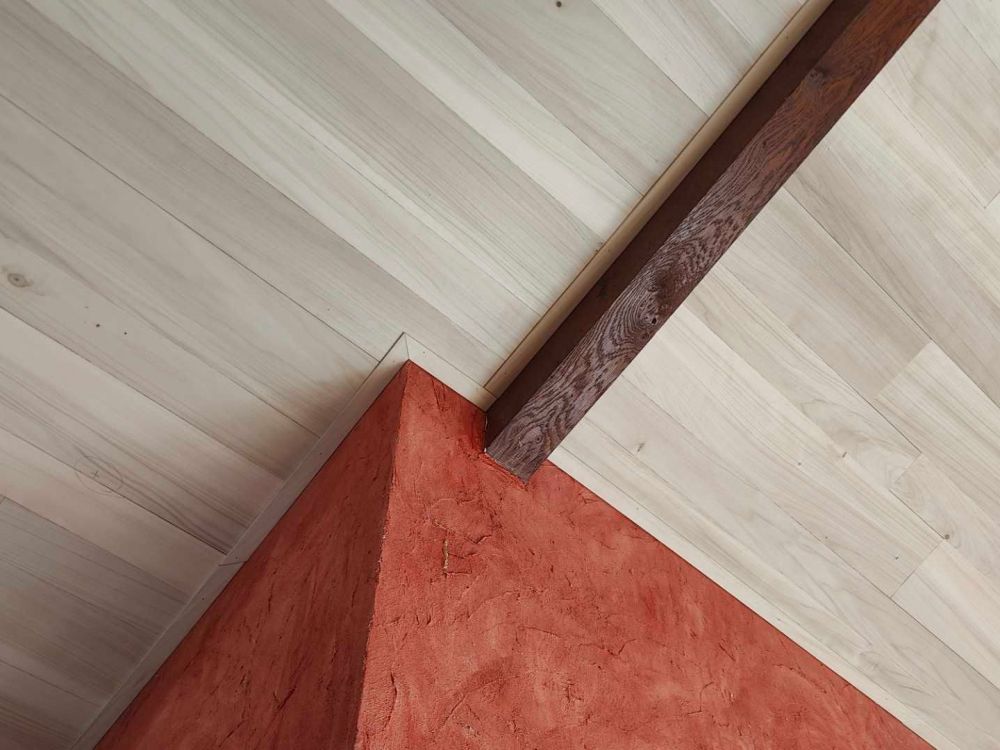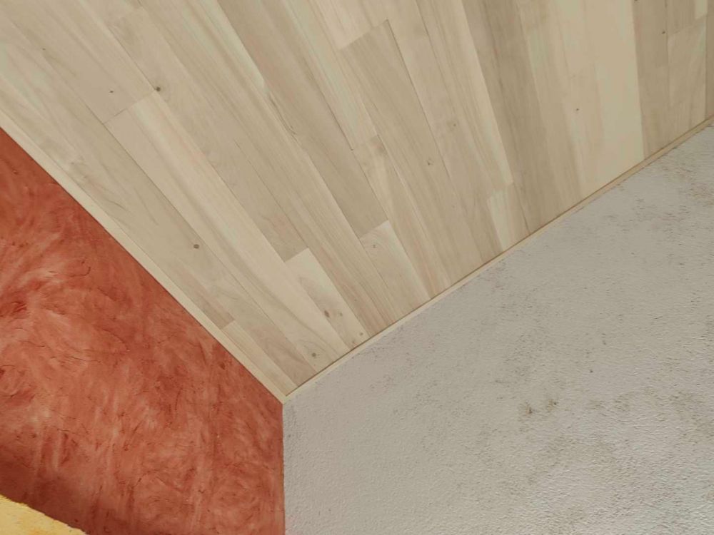 Pose de laine de bois en couches croisées et finition avec un revêtement en lambris peuplier pour assurer clarté et chaleur visuelle.