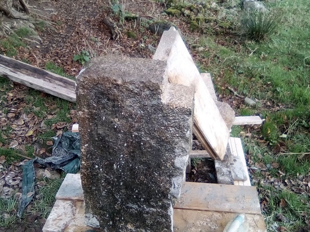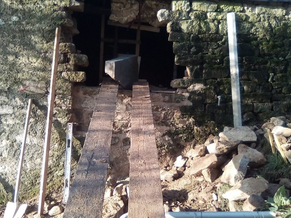 Création d'une petite fenêtre en pierre après un mouvement de bâti. Le bâti avait glissé sur deux plans il a fallu en sélectionner pour implanter cette petite ouverture. Les pierres étaient désolidarisées entre elles, deux fissures dont on voyait le jour à travers menacées la structure du bâti L'appui est en schiste bleu de Guerlédan, les jambages et le linteau sont en granit. L'appui Les feuillures, une partie du jambage ont été taillé à la main.